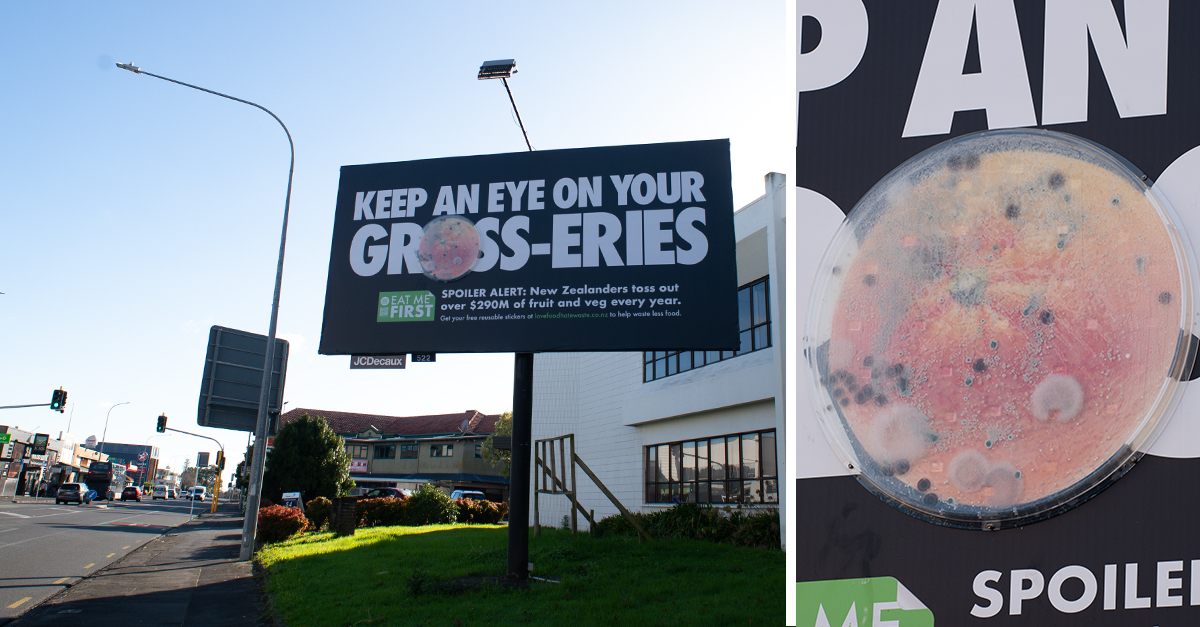 They utilised several of JCDecaux's premium Large Format static sites across Auckland to grow actual mould on larger-than-life petri dishes to highlight the issue of food waste in NZ. As the mould was alive, it continued to grow and change for the life of the campaign making this an eye-catching and ever-changing creative.